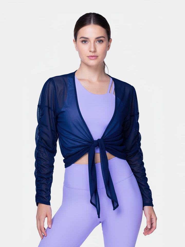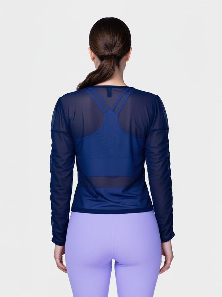Blusa de malla manga larga con detalle de frunce, cintura ajustable y silueta semi-ajustada. Liviana, fresca y con aplique PVC para un estilo moderno y versátil.