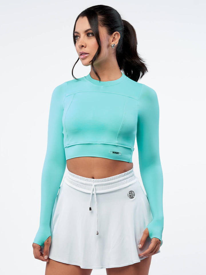Crop top deportivo de manga larga con dedal. Tejido elástico y transpirable. Máxima comodidad y libertad de movimiento para entrenar con estilo.