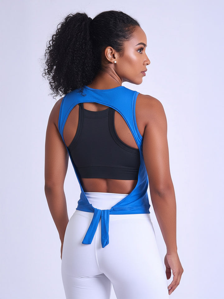 Crop Top Rosie de la colección FEELING: blusa vaporosa con cintura ajustable y escote en la espalda. Fresca, versátil y fácil de combinar para tus entrenamientos diarios.