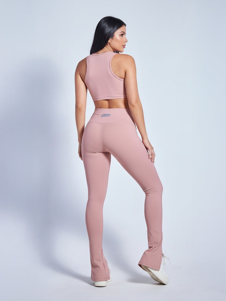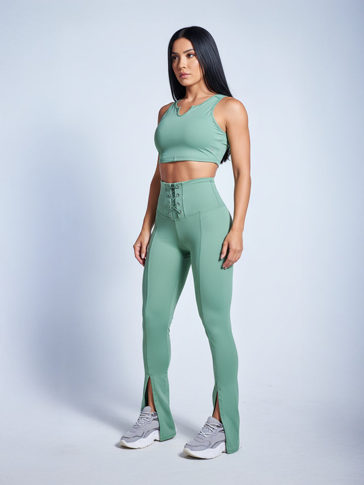 Leggings flare de talle alto con pretina anatómica, ojales metálicos y cinta decorativa. Cortes que estilizan, abertura y colores tendencia. Suaves, compresión alta y reflectivos.