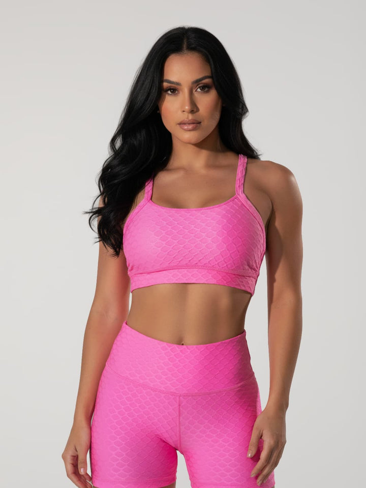 Top Loving con escote redondo, realce de busto, espalda descubierta y herrajes Bonlife. Tela texturizada, suave y cómoda. Ideal para entrenar o lucir con estilo. Composición: 88% poliamida- 12% elastano.