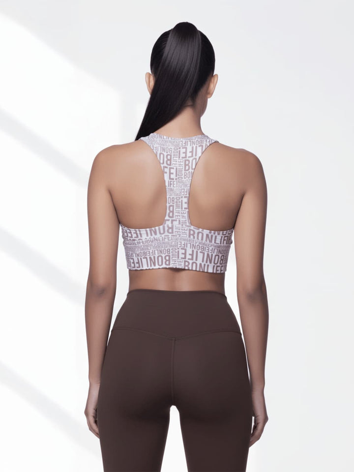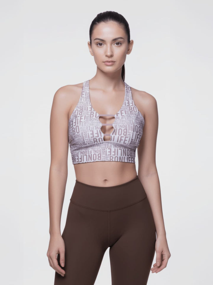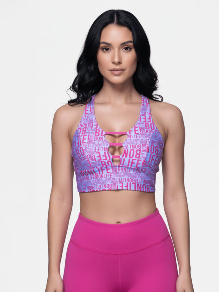 Top deportivo Melody: estampado vibrante con tres tiras frontales que realzan el escote. Comodidad, soporte y tejido transpirable para mantenerte fresca y con total libertad de movimiento.